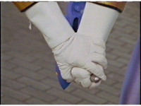 Pan up from the Sabers to Blue & Yellow gesturing hands. |