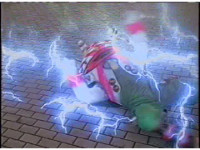 Juggelo is sparkily struck by the Revolver Phantom attack, causing him to crackle. Lunar Wolf talks to Red, who responds, Jindrax listening from behind the Megazord, acting worried. |