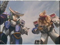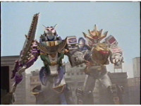 Jindrax reaches out in protest and appears mortified, dropping his blades. The two Megazords turn around and face him, Yellow talks, then Jindrax pulls out a sword, charges forth, the Megazords following suit, and the Duke Org is just about to strike. |