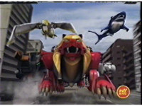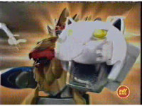 Lion Tamer Org pops up in the corner and talks while the Wild Force Megazord formation sequence plays. |