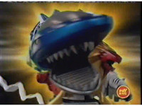 Kongazord Striker waves its glowing-antler Clutcher arm around, when Sharkzord leaps in and chomps down sparkily, Blue reacting, as Giraffe spear inserts within the Clutcher, pulls the arm around, then allows Wild Force Megazord to sparkily punch its Elephant Shield into Kongazord. |