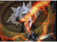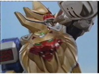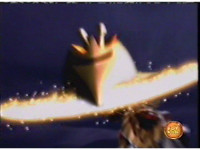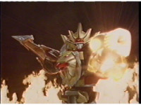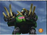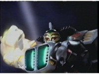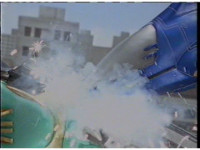 Wild Force Megazord slashes its Fin Blade downward at the Rangers explosively. |
