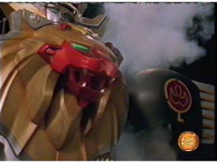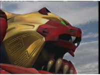 Wild Force Megazord turns, and lowers its weapons, zoom in on its chest., Red Lion roaring. |
