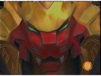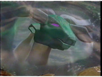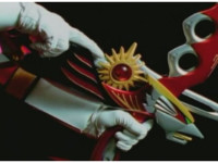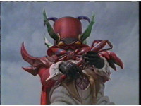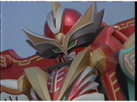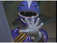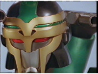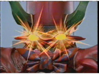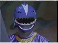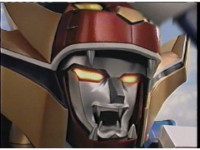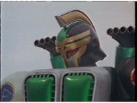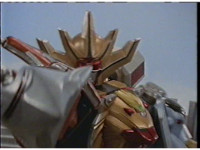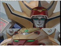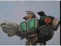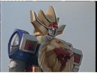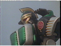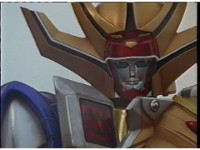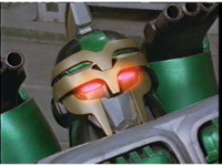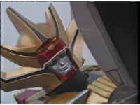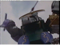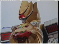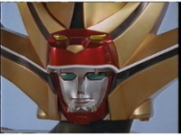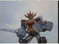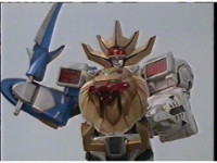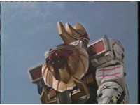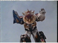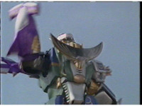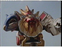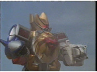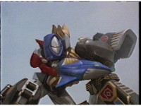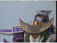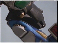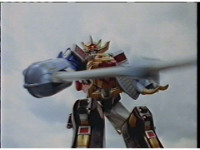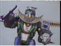 Wild Force Megazord passes its Fin Blade over its face, changing to a fierce expression. |