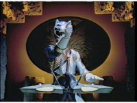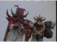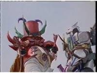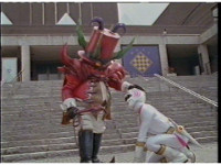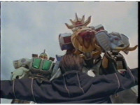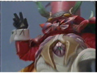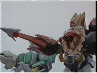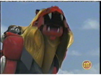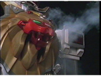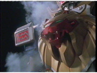 Lion Tamer Org walks over to Wild Force Megazord Spear & Knuckle, pats Red Lion on the chest, then cracks his whip. |