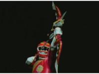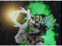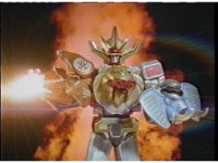 Wild Force Megazord Spear & Shield Mode readies spear arm, and fires it forth, as the Giraffe Spear ignites with flames. |