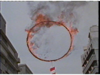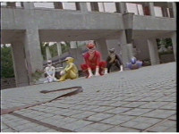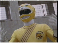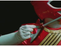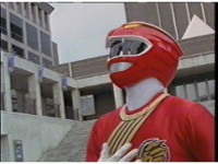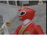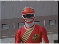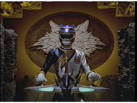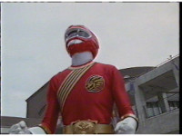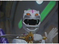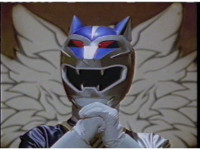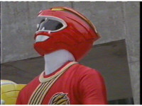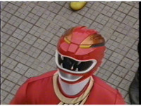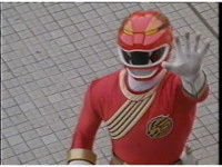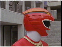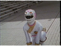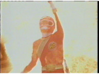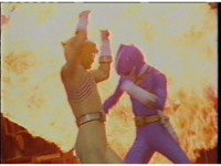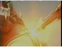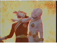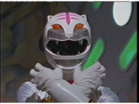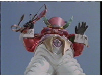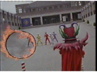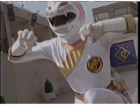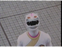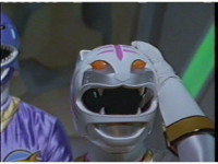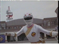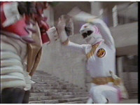 White scratches the ground and then charges forth, Lion Tamer Org's eyes flash, a flaming hoop materializes, she runs at the Org, he talks then cracks his whip, causing the Ranger to suddenly jump through the hoop, then landing an acting like a tamed animal on her knees, until Lion Tamer Org comes over and pets her. The Rangers react, Blue especially talking, which breaks White out of it, snapping away from the Org, and her teammates regroup around her, they all talk to her, and she responds in a bit of a panic. |