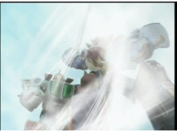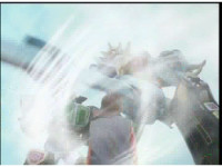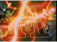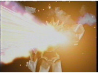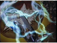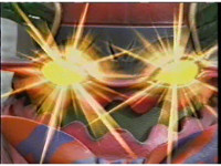 Wild Force Megazord's fists are sparkily struck by the Bears' beams. |