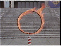 Lion Tamer Org talks and holds his whip, Red Lion approaches, the Org's eyes flash and a flaming hoop materializes, before cracking his whip, causing Red Lion to jump up through the hoop, the Rangers reacting. |
