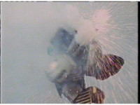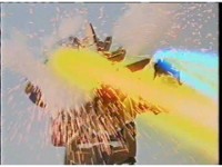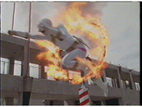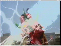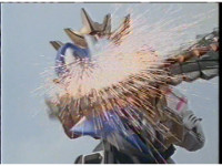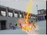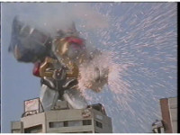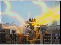 Wild Force Megazord is struck sparkily in the chest and falls over. |