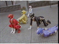 The whip cracks before the Rangers, causing them to stop and get on the ground like their respective animals. |