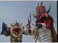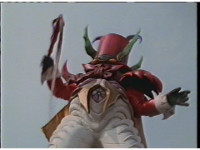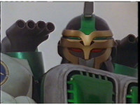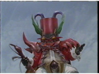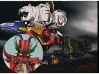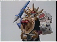 Lion Tamer Org talks and cracks his whip, the Megazords turn their attentions toward him. He reacts, nervously. |