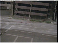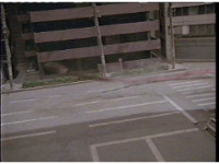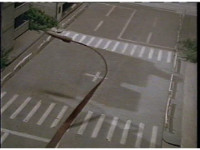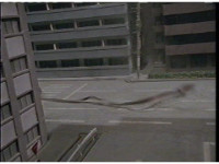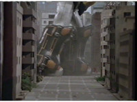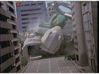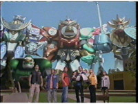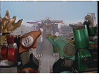 Wild Force Megazord lands in the city, poses battle ready, and the Rangers react. |