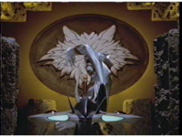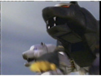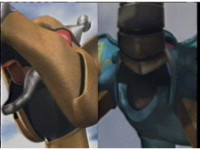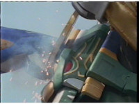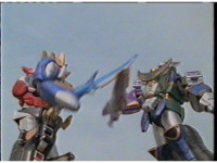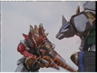 Wild Force Megazord raises its Fin Blade again, and begins to slash downward, the Rangers react and brace for impact, until Predazord Gator Staff-blocks the Blade sparkily, the Rangers react, Predazord shoves the Megazord's weapon aside, and Red nod-talks upward. |