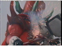 Lion Tamer Org gets struck by the Giraffe spear and spark bursts, he reacts, then Isis Megazord lifts him up by the spear and flings him skyward, before Isis Megazord then leaps up and flies into the air. |