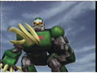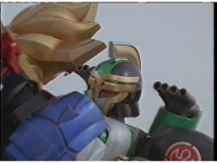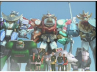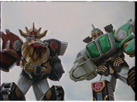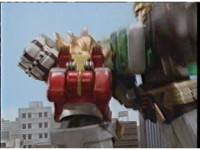 Wild Force Megazord Spear & Knuckle steps in and stands by Kongazord Striker Clutcher's side. Predazord breaks out of its bonds, Lion Tamer Org talks, and the two Megazords face the Predazord, then pose battle ready, and charge in, each striking Predazord sparkily, Red reaches out, as Kongazord beats on it. |