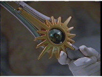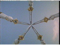 The Rangers talk amongst themselves, then pull out their Sabers and summon to the sky. |