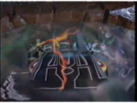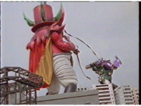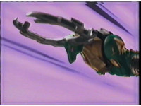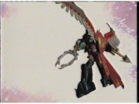 Lion Tamer Org talks and walks in front of the posed Wild Force Megazord, the Rangers react, Blue talking upward, then the Org talks some more and cracks the whip. The Megazord turns and looks at the Rangers, then marches toward them, they react, as it begins to slash its Fin Blade downward. |