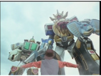 Sword & Shield Mode arms connect to Wild Force Megazord, and Black Bear connects to Kongazord Striker, the two Megazords begin to march forth as Kite races toward them below. Wild Force Megazord Sword & Shield slashes down at the Rangers, knocking them down. Kongazord fires its shoulder cannons down at them explosively. |