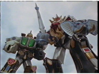 Wild Force Megazord in Sword & Shield Mode performs the Pachyderm Crusher Attack. |