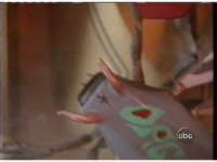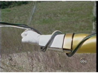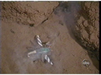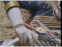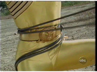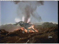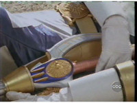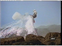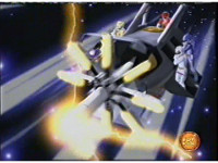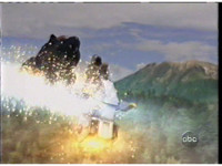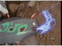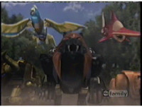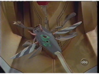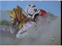 Wild Force Megazord is sparkily struck by the glowing arrow, right in the bug. The Rangers react, the bug falls off and crackles, and the Megazord bends over, crouching. Mandilok tries to get the remote to work to no avail, Animus turns around, so the Orgs fade out of the scene. |