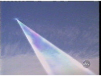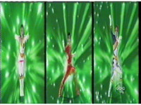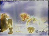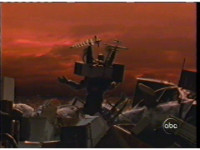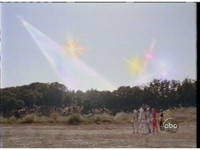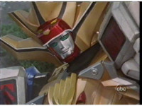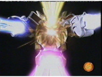 Sparkles converge into Animus' chest, the Rangers react, and both Animus & Wild Force Megazord begin to glow brightly, as a light shines down from the sky, the Rangers standing there watching incredulously, as the Megazords turn to balls of light and fly up into the spotlight. |