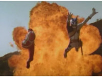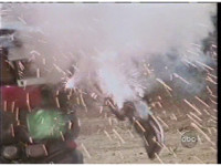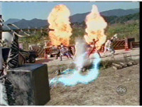Monitor Org raises his controller hand, presses it, and suddenly replicates. Wild Force Megazord reacts, Blue nod-talking urgently, before the many Orgs fire green bolts forth, bursting and exploding around the Megazord. The Rangers are thrown about, then Red raises a fist and begins to motion. |