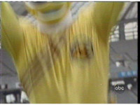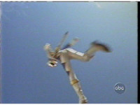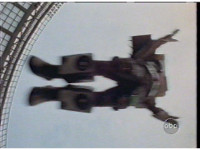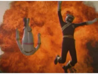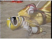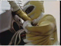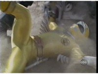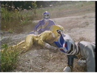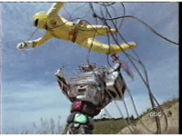 Yellow flies forth, Monitor Org jumps, grabs her, and flies her into the sky above the stadium, then guides her back down to a spot outside in a field, where he slams the Ranger down, then rolls over and extends out lots of cords. |