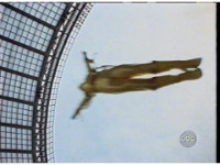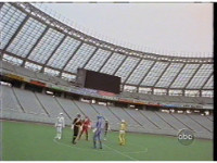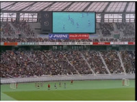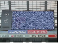 Kids playing soccer appears on the Jumbotron, until the image flickers to static. |
