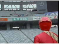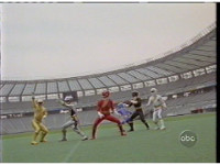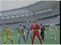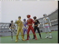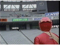 The six Rangers arrive on the stadium field, and glance about the empty place. |