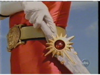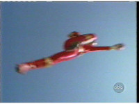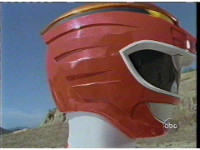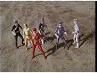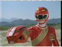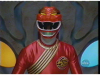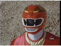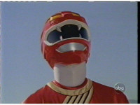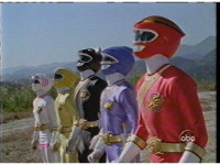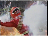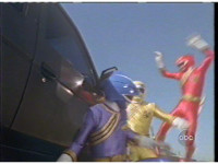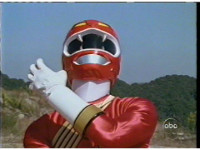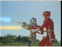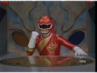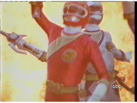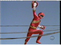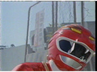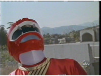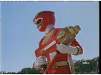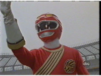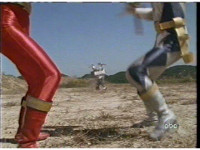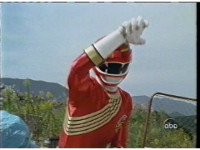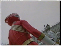 Red leaps in and cuts the cords sparkily with his Lion Fangs, knocking Monitor Org over, the Rangers regroup, and Red poses fiercely, before looking to our right suddenly. |