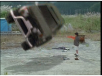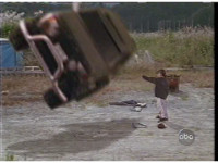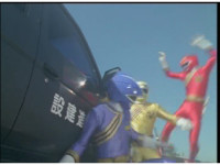 Red looks up, and the Rangers dive out of the way as the SUV falls straight down on top of them. |