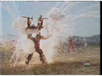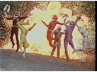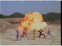 Monitor Org is Savage Slashed, then energy struck, crackling as he then collapses, and explodes massively behind the posing Rangers. |