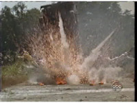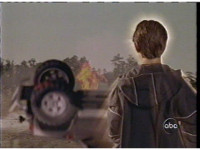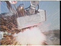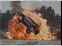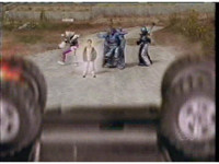 Monitor Org fires electricity at the SUV, exploding it behind the Rangers. |