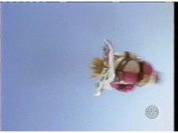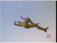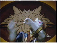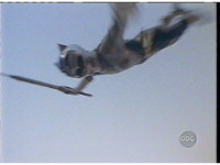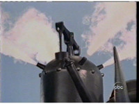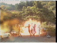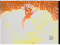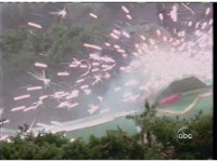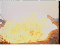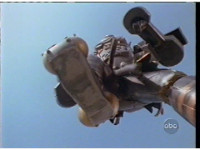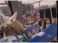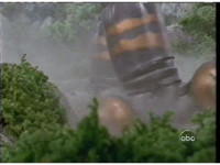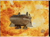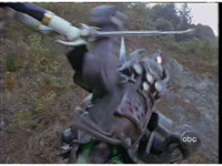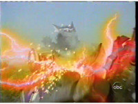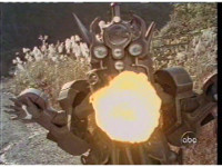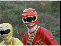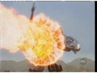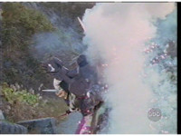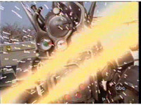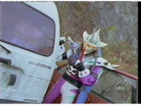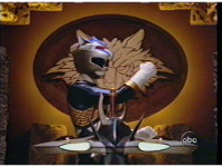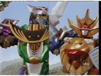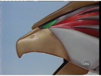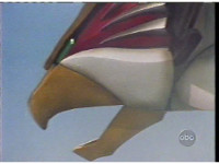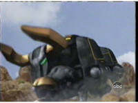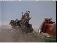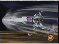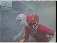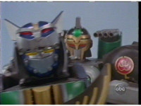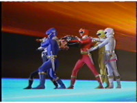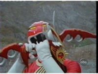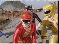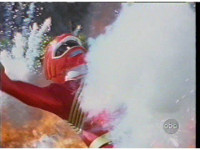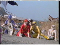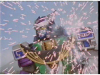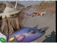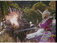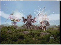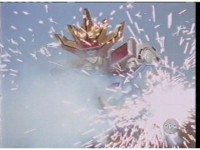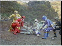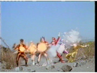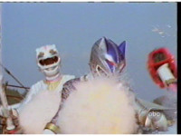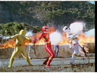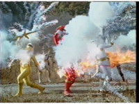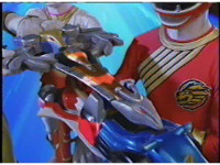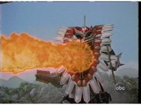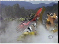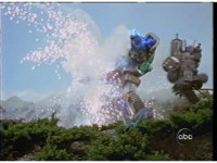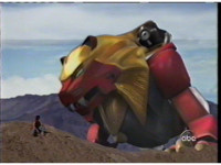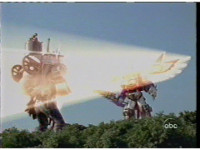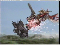 Locomotive Org spews flames at the Wild Force Megazord, engulfing it until it explodes massively, Red Lion & Eagle dropping down dazed, while the Rangers fly to safety on the Soul Bird, Yellow & Red talking, then White & Blue talk when they see White Tiger & Shark also dazed. |
