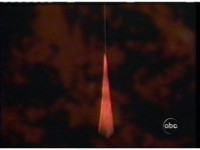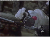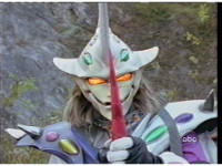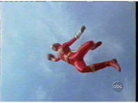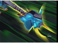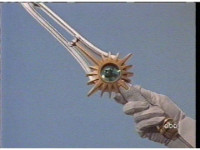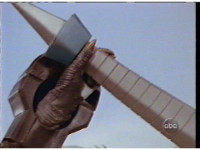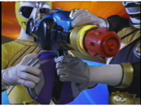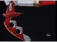 Red pulls out his Saber, sticks the Falcon Crystal in it, then changes Falcon Summoner to Archer Mode, loads his Saber into it, and fires a red ball of energy skyward, where it turns the black sky to a cloudy blue one. |