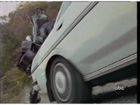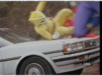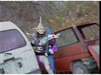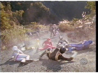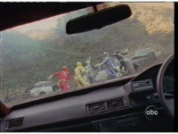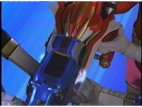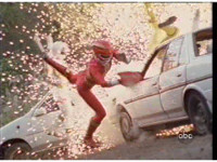 Locomotive Org pushes a car at the Rangers, who leap out of the way before it sparkily crashes, Yellow talks, then Red, as the Org approaches them while they're dazed. |