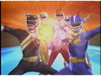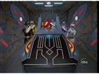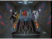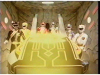 The Rangers are all dumped on the ground, they quickly begin to recover, watchin Locomotive Org sparkily stomping on Alligatorzord. Lunar Wolf reacts, and talks to his teammates. Yellow talks to Red, then Black talks to her, as we see Rhinozord dazed. Blue speaks quickly, Yellow looks down while talking, but Red is hyped, talking to them all excitedly, Black, White, Yellow, and Blue all reply affirmatively. |