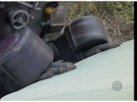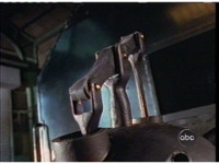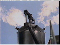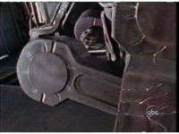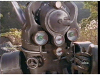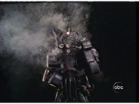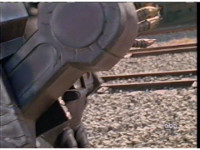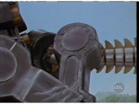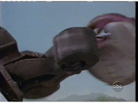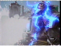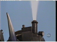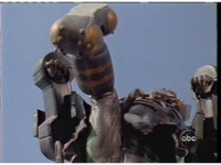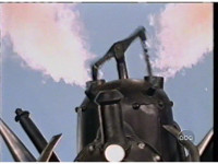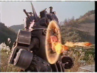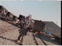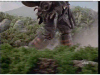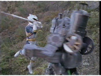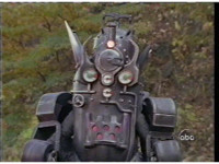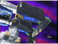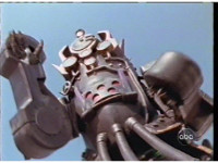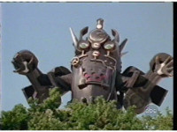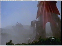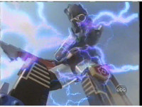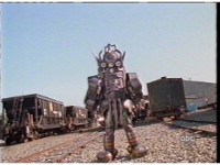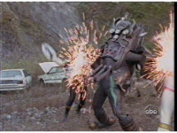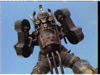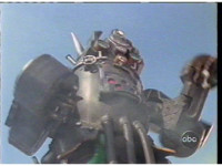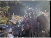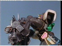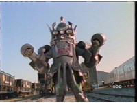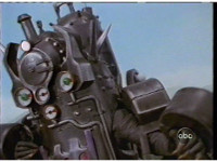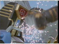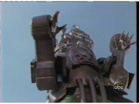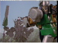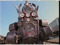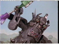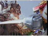 Wild Force Megazord Sword & Shield & Predazord face Locomotive Org, who talks, then zoom in on Red talking, Lunar Wolf replying to him, before both Megazords march forth, sparkily slashing the Org, who is unharmed, then grabs both their weapons, holds them tightly, the Rangers struggling confusedly, before Locomotive Org then spews steam at the both of them, spark bursting the pair. |