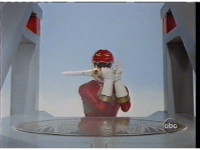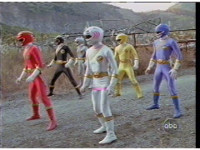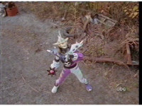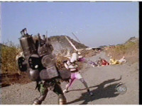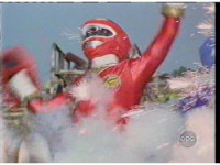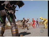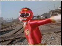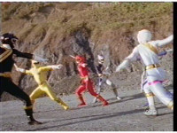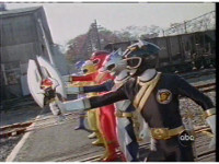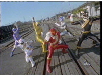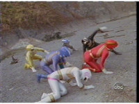 Red is flung through the air, landing in a new location, where Locomotive Org sparkily bashes his way through the Rangers, finally attacking Yellow. |