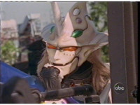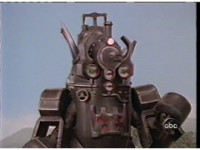 Locomotive Org approaches, the Rangers pull out their weapons, and charge in to fight him, all battling the Org, while Jindrax lurks nearby, talking to himself. |