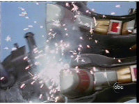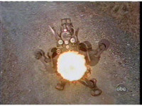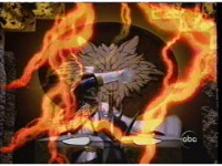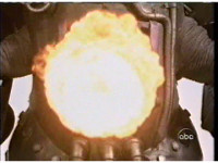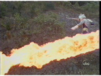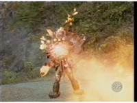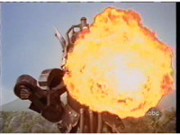 Locomotive Org fires hot coals from his stomach at the Rangers, exploding them and around them. |