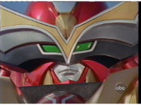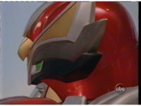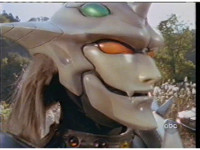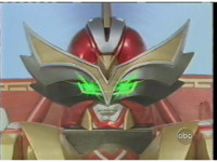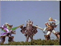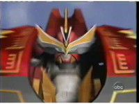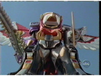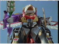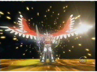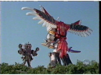 Red Lion roars, Bison's back shifts around into legs, Eagle locks in her wings behind Red Lion's chest head, causing the Wild Force Megazord's head to pop up out of her, eyes glowing. |