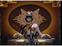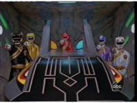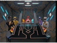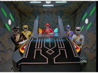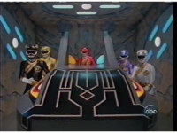 Jindrax grabs Locomotive Org and talks to the Rangers, they watch dumbfounded, White, then Yellow, talking, then the Org talks, Yellow talks to Red, who responds, before all six stand up. |