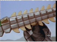 Drilling its Gator tailed arm forth, Predazord performs the Revolver Phantom attack. |