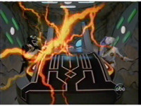 Locomotive Org is struck by the Giraffe spear, staggering back crackling, as Kongazord Striker Spear Mode joins Predazord's side. The Org tosses the Gator Staff down, gets steamed up, revs up, and choo-choos his way between the two Megazords, spark bursting both, before he turns around and sparkily punches Predazord, and sparkily kicks Kongazord, causing both to crackle. Locomotive Org then lets off steam and fires flames forth at both Megazords, engulfing them, crackling the cockpits until they flare out. |