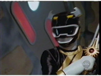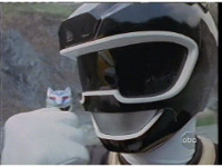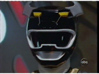 Black motions his Saber, causing Isis Megazord Predator Mode to fly up into the air, and begin to repeatedly bicycle kick Locomotive Org back across the battlefield, until he falls down. Black then talks, Red also talking. |