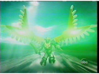 Isis Megazord Predator Mode's wings begin to glow, as does the Soul Bird, Locomotive Org gets up and looks as the charged up Isis Megazord Predator Mode, which fires wing beams that explode, crackle, and spark burst him. |