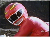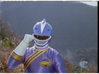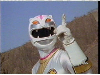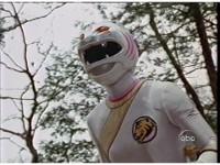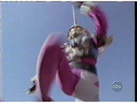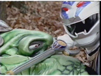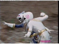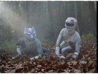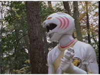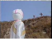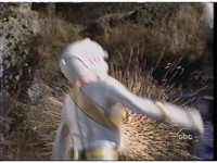 Jindrax pops up atop a nearby cliff, he talks to the Rangers, who react, then Toxica warps in, White reacts, as she swings down and sparkily strikes the Rangers on the way by, then the Rangers regroup around White. |