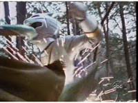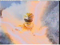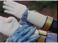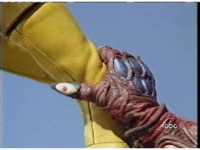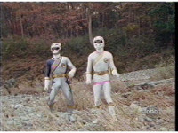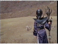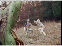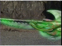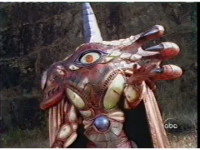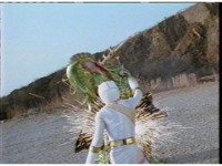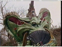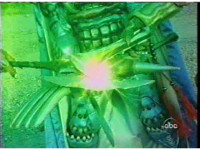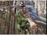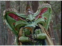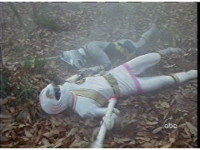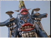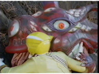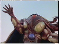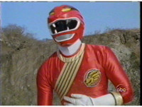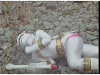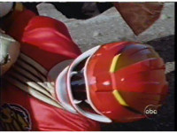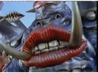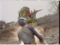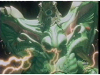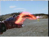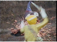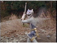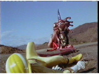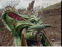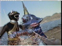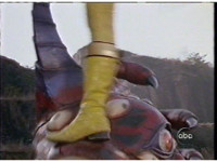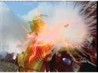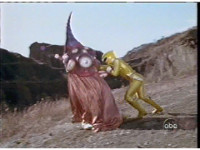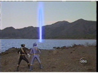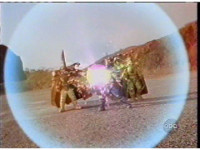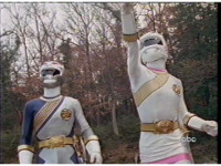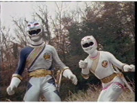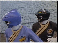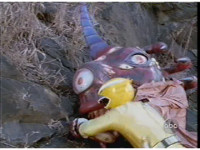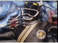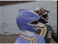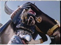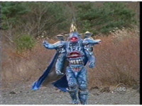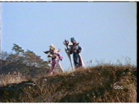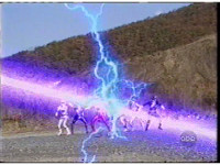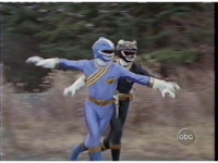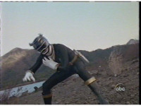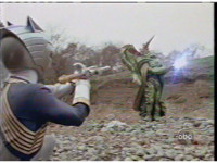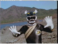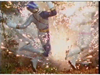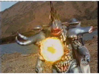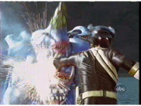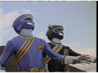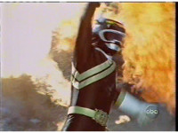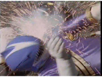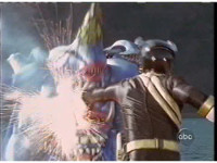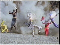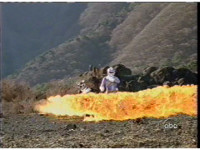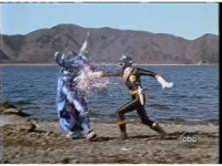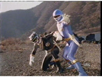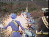 Mandilok sparkily beats on Black, then tosses him aside, Blue regroups with him, when the Org General then spews flames at the pair, bursting around them, causing Black to collapse and pass out. Blue rushes to his side, talks to and comforts him, then he gets up and both charge into action. |
